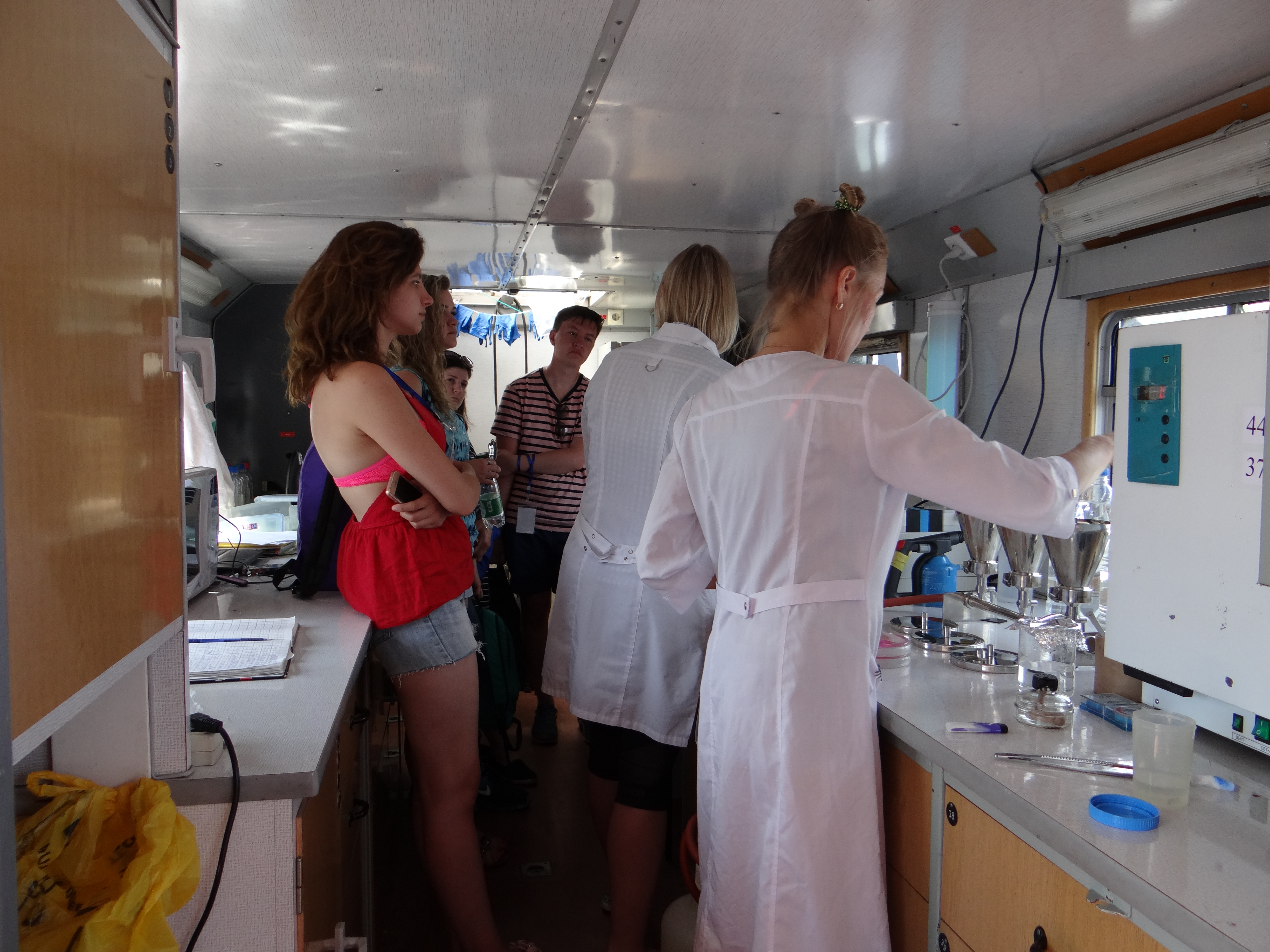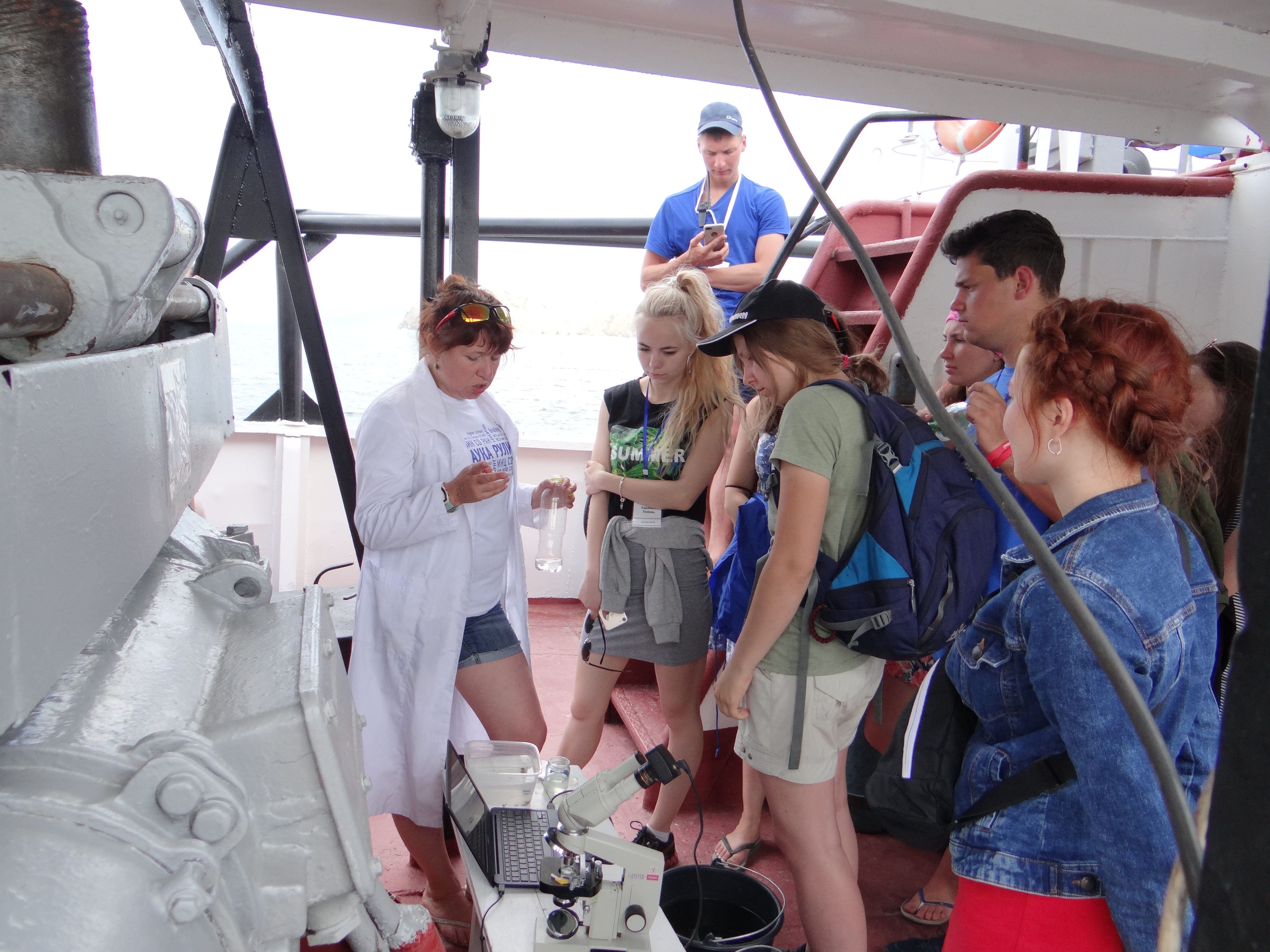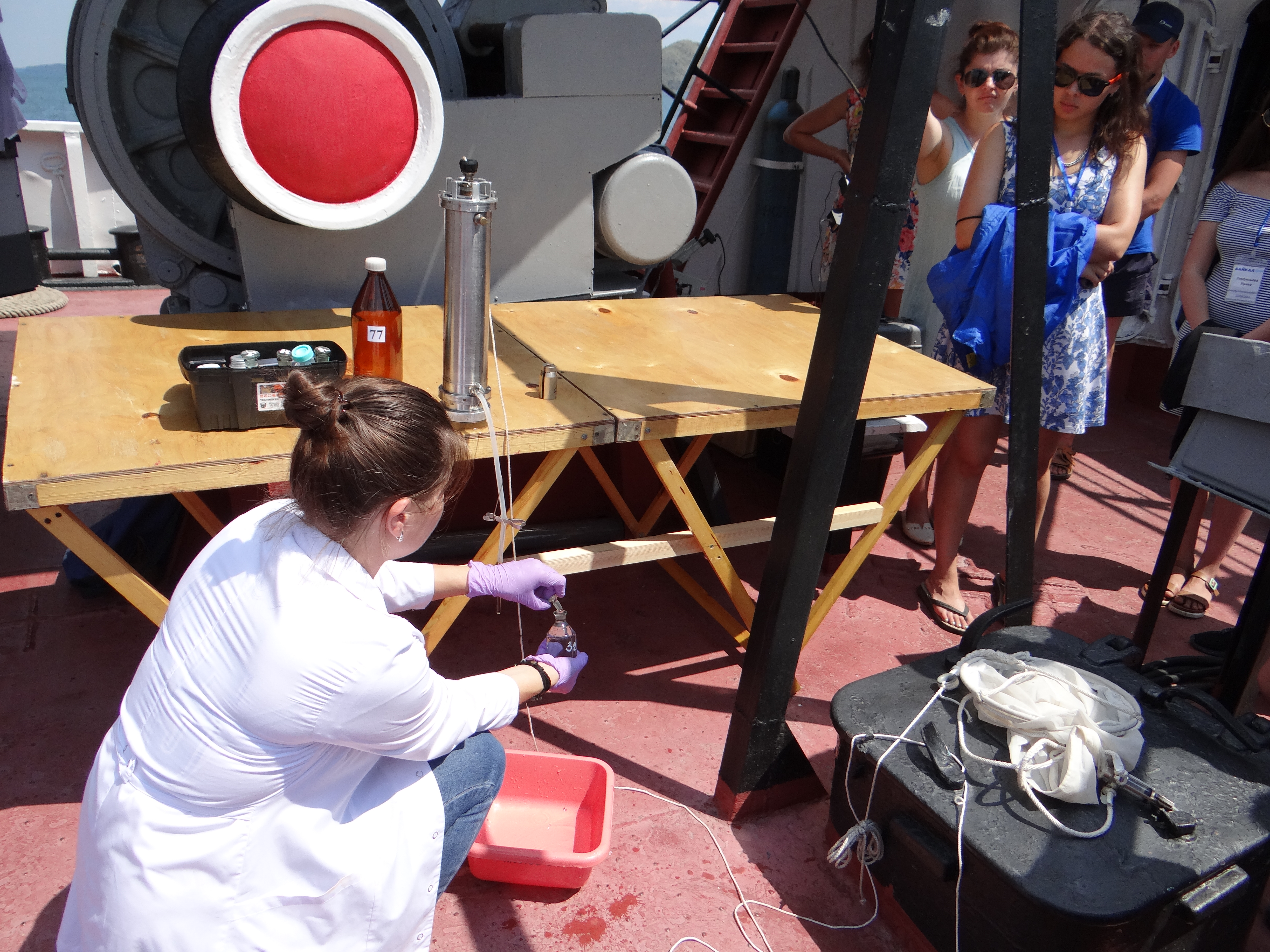 During the expedition on board RV "Akademik V.A. Koptyug", young researchers of Limnological Institute took part in the International Youth Forum "Baikal - 2018" on July 2-6, 2018. They sampled zooplankton and benthos for practical training and demonstration at lectures, as well as water for hydrochemical express analysis. Excursions-lectures were delivered for 215 participants of the Forum on the following topics: "Hydrochemistry of Lake Baikal", "Monitoring Studies of Baikal Plankton: History and Present", and "Recent Microbiological State of Lake Baikal". During the expedition, 52 water samples were collected in Maloye More Strait for sanitary-microbiological analysis. The researchers from Laboratory of Aquatic Microbiology analyzed total coliform bacteria, thermotolerant coliform bacteria, enterococci and total bacterial count.