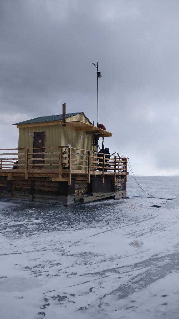 At the initial stage of the expedition (January 30-31), ice reconnaissance was carried out near the Listvyanka settlement – Bolshiye Koty settlement: ice thickness was measured and the location of ice cracks was mapped. When the ice road was opened in the Maloye More Strait, an ice thickness gauge was installed, which allows real-time monitoring of the growth (melting) of the ice cover. Along the Olkhon Island coast near the Maloye More Strait, reconnaissance of the ice structures “mounds” was carried out. From February 20 to February 23, the investigations were carried out at the Marituy-Solzan section and in the area of the manifestation of the ring structure near the Kultuk settlement. From March 26 to March 29, the investigations were carried out at the sections Listvyanka-Tankhoy and Kadilny-Mishikha. On March 4, an ice camp was organized in 7 km from Beryozovy Cape to conduct complex experiments and monitor the under-ice layer, including diurnal stations to study the effect of illumination on plankton migration. At the section from the Institute’s research station in the Bolshiye Koty settlement, the thickness of the ice in motion was continuously measured using a Pikor-Lyod ice thickness gauge with simultaneous estimation of flow velocities: in the zone with high flow velocities, ice thickness reduces. On the pier of the Institute’s research station in the Bolshiye Koty settlement, a new mast was installed for the hydrometeorological post.