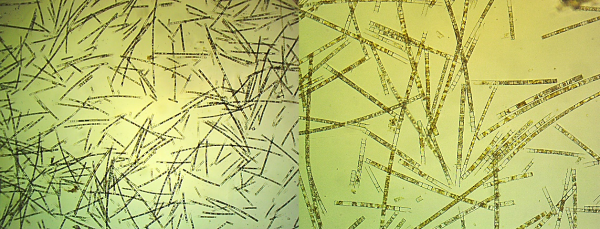 3. Обследование поздневесеннего фитопланктона в прибрежной зоне озера показало, что распределение планктонных водорослей неравномерно по акватории. В южной котловине вегетация, практически, закончилась, зафиксированы единичные клетки и колонии, интенсивно вегетировавших в подледном планктоне видов. Биомассы низкие: около 100 мг/м3. Исключение составила станция в районе г. Бабушкин (326 мг/м3), где отмечены значительные концентрации диатомеи Ulnaria acus и зеленой Koliella longisrta. Количественные характеристики фитопланктона в средней котловине более богаты, здесь вегетировали те же виды, что у г. Бабушкина. Максимальные биомассы зафиксированы в северной котловине озера (до 400-500 мг/м3) за счет присутствия в планктоне крупноклеточной колониальной диатомовой водоросли байкальского комплекса Aulacoseira baicalensis (рис. 3). Её развитие подходило к завершению, о чем свидетельствуют массовые скопления водоросли на дне водоема.